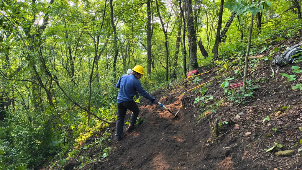 Once WisCorps was approached with a possible partnership opportunity, our first step was to conduct an initial assessments of the Bluff Trail system. As the Operations and Training Manager, I determined the proposed project scope was conducive for a crew project. The park was in need of trail rehabilitation and reroutes along several trail segments. After flagging these specific work areas along the park’s White and Orange segments, I began to build WisCorps’ plan for rehabilitation, structure builds, and brushing work, which would allow the park to become more accessible for community usage. It was clear to us that we’d need to re-dig several steep sections to put in reroutes or c-steps. After a couple of more visits, which included both the WisCorps Director, Eric Robertson and our Field Coordinator Kayla Paulsen, we finalized our plan to accomplish the proposed scope of work across several weeks in our summer and fall field seasons.